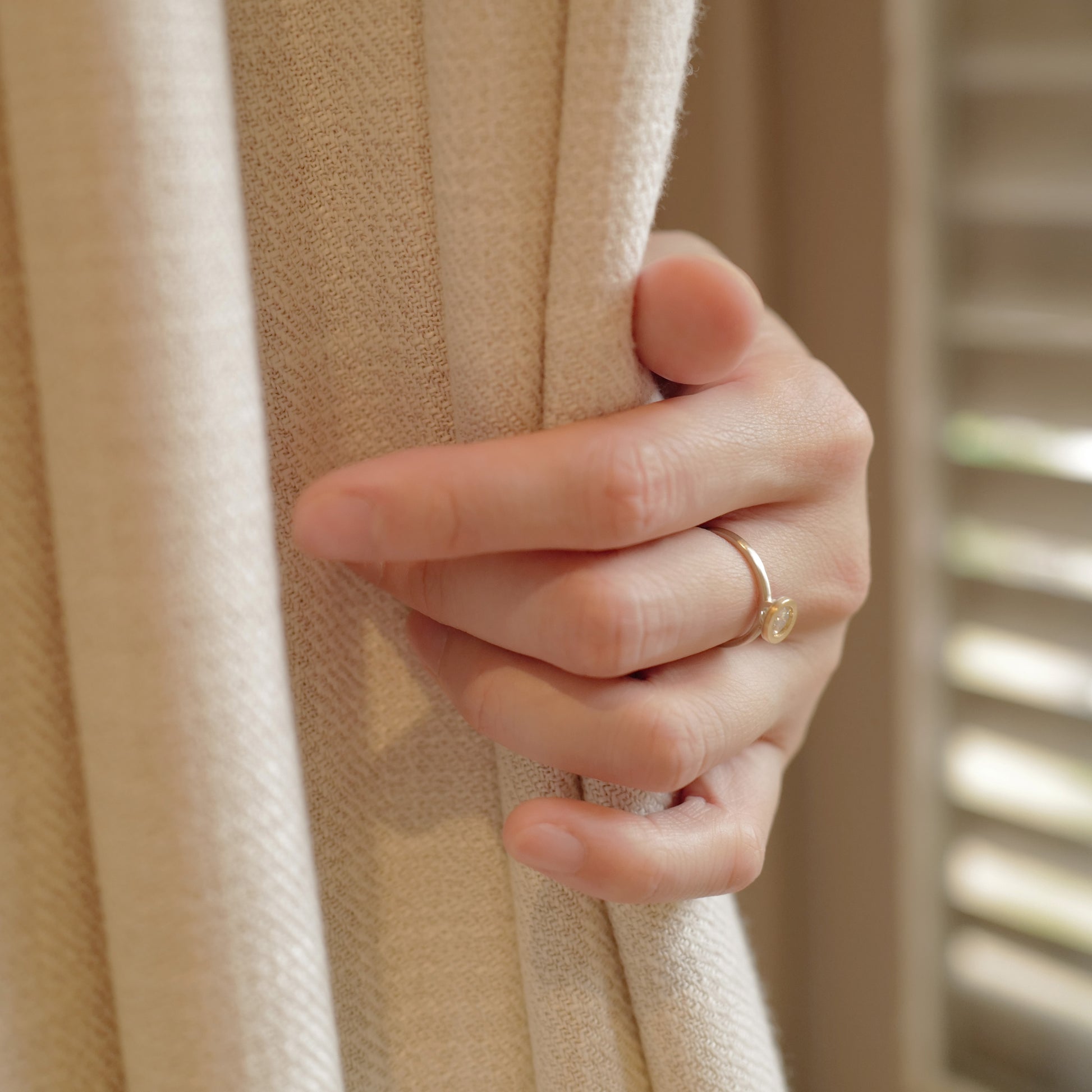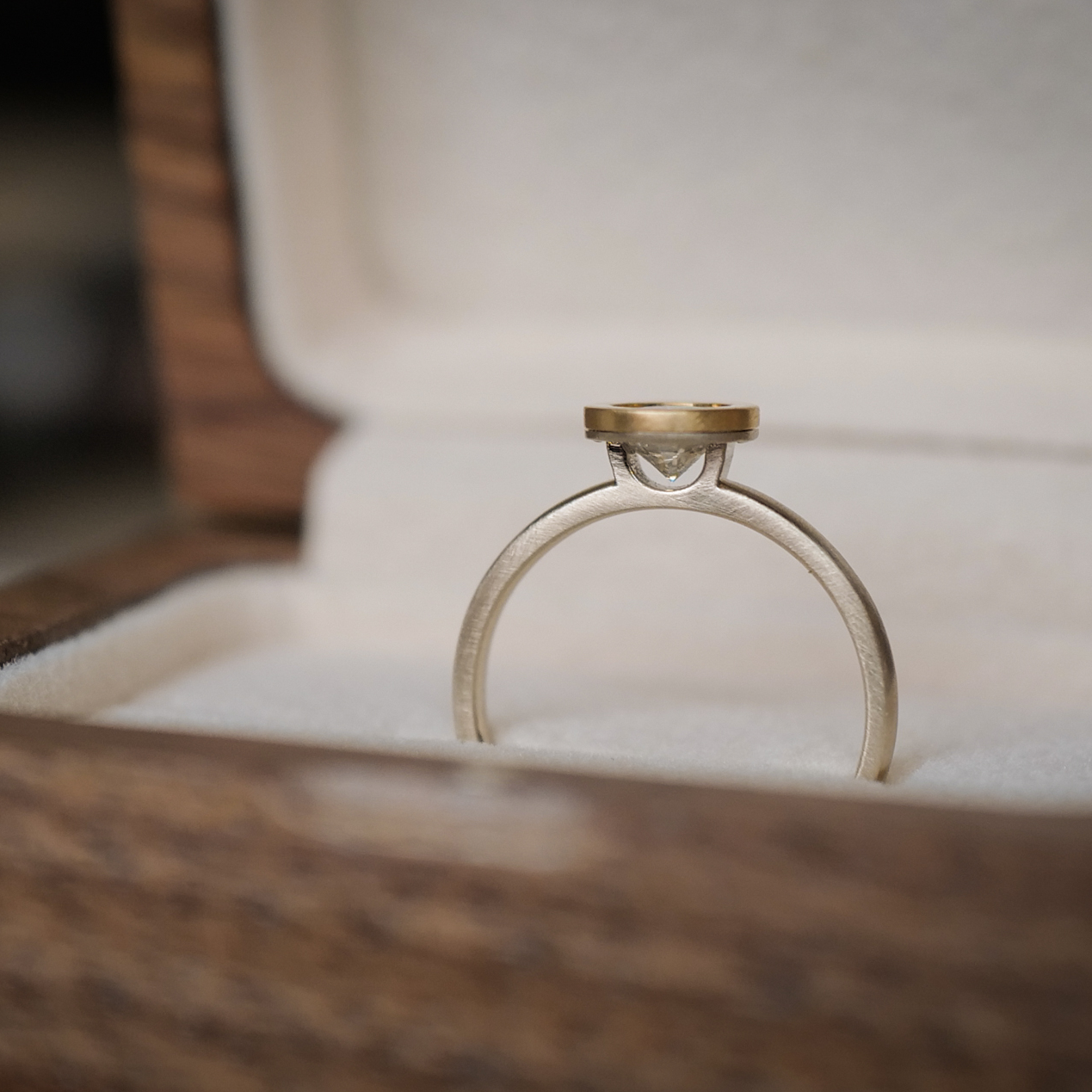 A minimum design, unique setting with a almost floating visual of a stone.